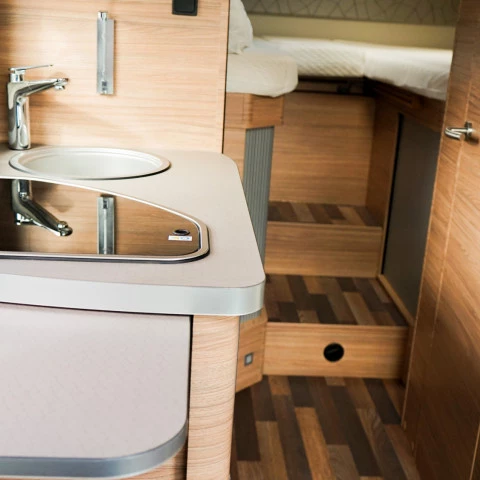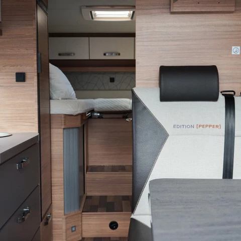 Reconocible por su cama sobre la cabina, la autocaravana capuchina es para grupos o familias con niños. Su diseño permite más plazas para dormir y un interior práctico y funcional para viajes largos.