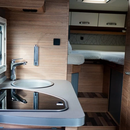 - Cocina equipada: Cocina de 3 fuegos con cubierta de vidrio, fregadero en acero inoxidable, frigorífico de 142 litros con selección automática de energía (AES)