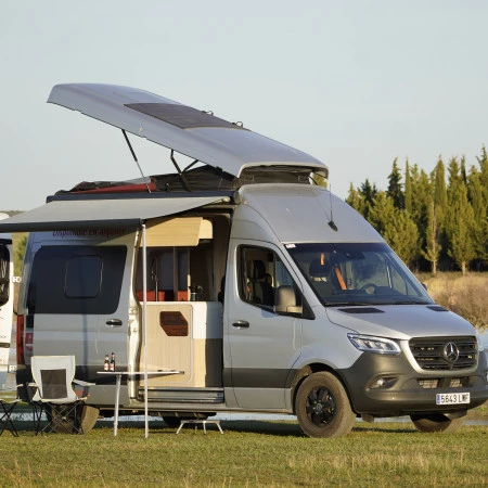 - Techo elevable con cama doble de 190*120 cm, salida para calefacción, techo doble impermeable y aislante térmico con cremallera y visión de apertura de lona para panorámica frontal.