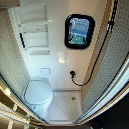- Baño con salida para calefacción, ducha con regulador de temperatura y WC químico y depósito extraíble de fácil descargado.
