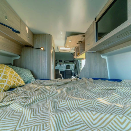 - Cama doble de 200*130 cm con colchón viscoelástico sobre somier en zona de descanso.